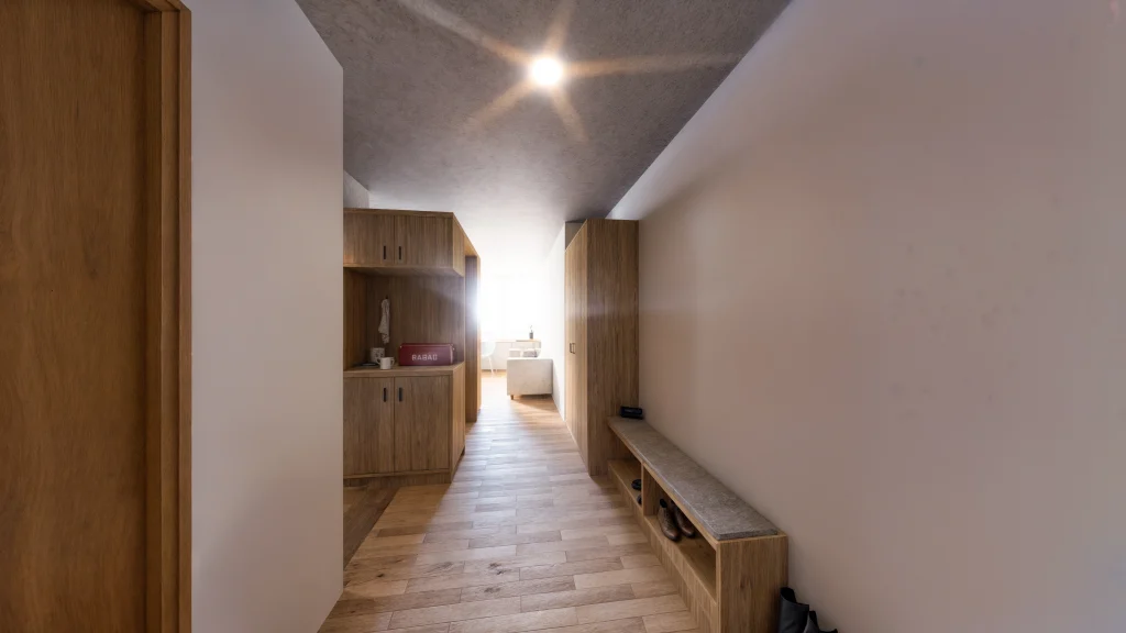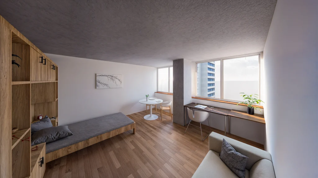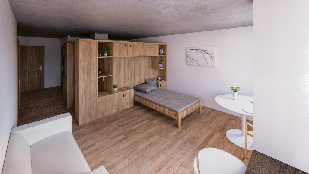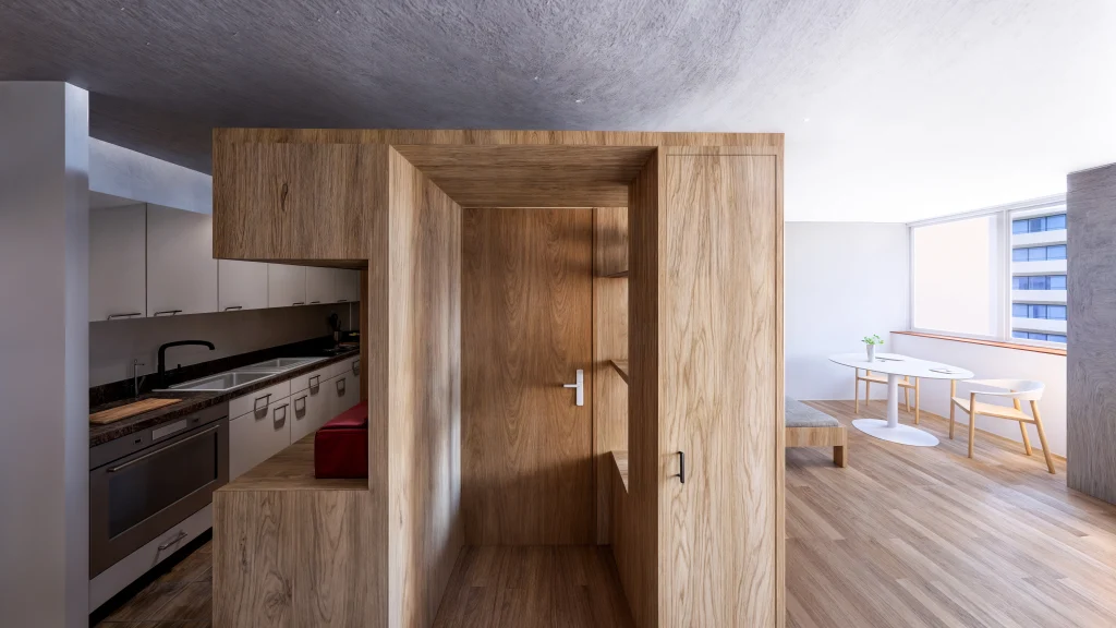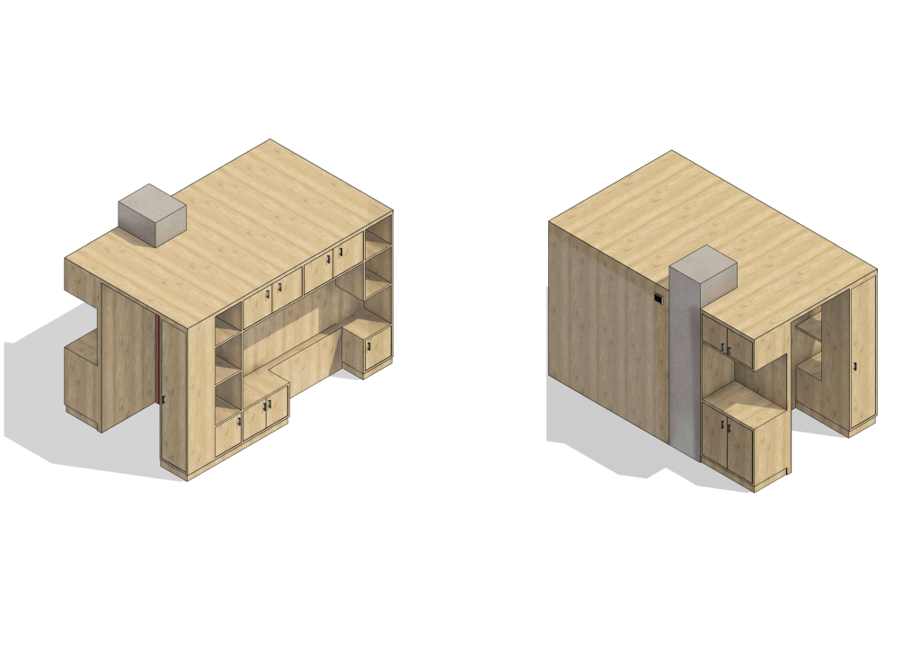Réalisation d’une esquisse de réalisation d’un bloc mobilier bois d’une salle de bain faisant office d’élément structurant et séparateur de l’appartement.